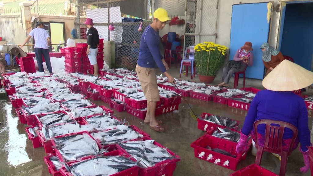 Những tàu cá đi biển xuyên Tết cũng bội thu và lần lượt cập bến để bán cá. Sau 18 ngày vươn khơi, tàu Qng 90242 - TS do anh Phạm Hồng Vũ, xã Bình Châu, huyện Bình Sơn làm chủ tàu khai thác được khoảng 6 tấn cá chuồn. Vừa vào đến cảng, thương lái đã đổ xô đến thu mua. Dù giá cá có giảm hơn so với mọi năm nhưng bù lại sản lượng đánh bắt đạt đã giúp anh và các thuyền viên có khoản thu nhập đáng kể.