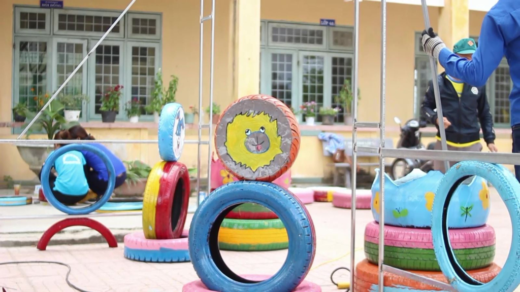Xích đu, bập bênh… Đặc biệt, nhiều đồ chơi ngộ nghĩnh được làm từ lốp xe ô tô, xe máy và các vật liệu tái chế. Ngoài việc giúp các trẻ em có nơi vui chơi lành mạnh, tránh xa các trò chơi tự phát có thể gây tai nạn thương tích, công trình còn mang thông điệp bảo vệ môi trường mà các bạn đoàn viên muốn gửi đến đàn em thân yêu.