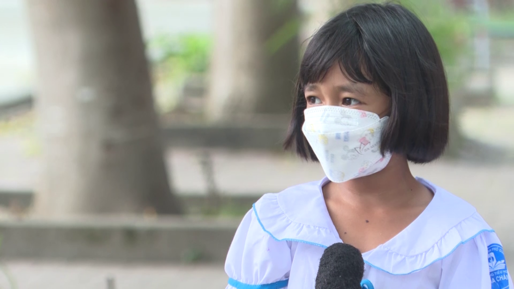 Bé Hồ Thị Vương, Trung tâm Công tác xã hội tỉnh Quảng Ngãi nói: Con ở đây rất là vui, con ở đây được mấy má nuôi dưỡng rất tốt, mấy má nấu đồ ăn con thích ăn nhất, con ở đây mỗi ngày được uống sữa, ăn cơm no.