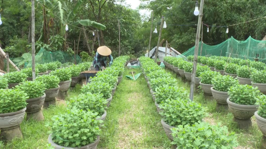Vườn trồng hoa cúc bán tết của ông Nguyễn Văn Nhơn thôn Mỹ Hòa, xã Nghĩa Mỹ. Vợ chồng ông Nhơn đang tập trung chăm bón cho hoa.