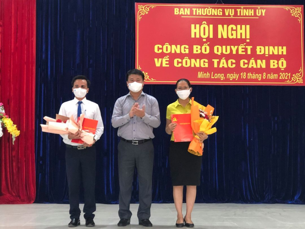 Chiều nay 18/8 tại huyện Minh Long, Thường trực Tỉnh ủy tổ chức Hội nghị công bố các Quyết định của Ban Thường vụ Tỉnh ủy về công tác cán bộ. Đến dự có Phó Bí thư Thường trực Tỉnh ủy, Trưởng Đoàn đại biểu Quốc hội tỉnh Quảng Ngãi Đặng Ngọc Huy; Trưởng Ban Tổ chức Tỉnh ủy Lữ Ngọc Bình; Trưởng Ban Dân vận Tỉnh ủy, Chủ tịch UBMTTQVN tỉnh Võ Thanh An; Chủ nhiệm Ủy ban Kiểm tra Tỉnh ủy Võ Văn Quỳnh.