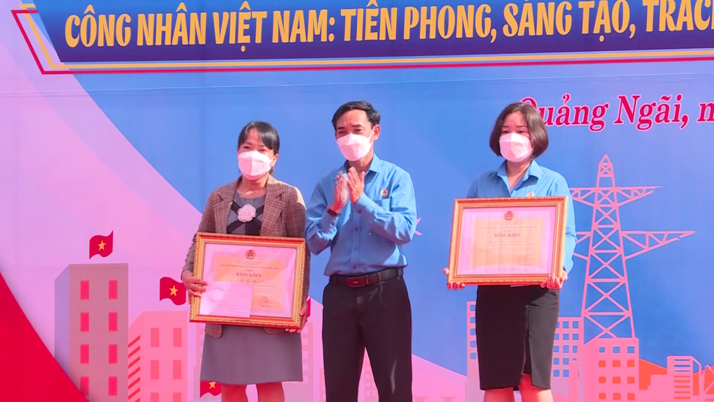 Dịp này, lãnh đạo Liên đoàn Lao động tỉnh Quảng Ngãi đã trao bằng khen của Tổng Liên đoàn Lao động Việt Nam cho Ngành Y tế tỉnh Quảng Ngãi và đoàn viên Võ Thị Thu Hồng, Trung tâm Kiểm soát bệnh tật tỉnh có thành tích xuất sắc trong phong trào thi đua đặc biệt: “Công nhân, viên chức, lao động nỗ lực vượt khó, sáng tạo, quyết tâm chiến thắng đại dịch COVID-19.
