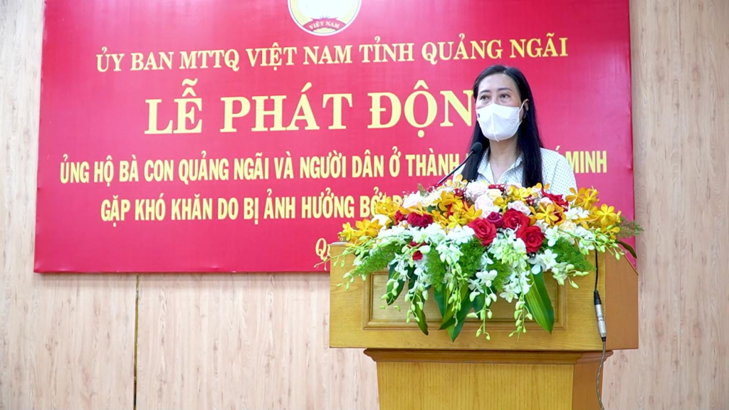 Trưởng Ban Dân vận Tinh ủy, Chủ tịch Uỷ ban MTTQ Việt Nam tỉnh Quảng Ngãi Võ Thanh An, nói: Phát huy tinh thần đoàn kết, đùm bọc, chia sẻ với những khó khăn với người dân thành phố Hồ Chí Minh và bà con Quảng Ngãi đang mưu sinh, học tập, công tác tại thành phố Hồ Chí Minh, được sự thống nhất của Ban Thường vụ Tỉnh ủy, Uỷ ban Mặt trận Tổ quốc Việt Nam tỉnh kêu gọi cán bộ, công chức, viên chức, người lao động, lực lượng vũ trang, các tổ chức, cộng đồng doanh nghiệp và các tầng lớp Nhân dân trên địa bàn tỉnh với tình cảm sâu sắc và trách nhiệm tham gia ủng hộ tiền, hàng hóa, vật phẩm hỗ trợ cho người dân thành phố Hồ Chí Minh và bà con Quảng Ngãi gặp khó khăn do dịch bệnh tại thành phố Hồ Chí Minh. Kinh phí và vật phẩm tiếp nhận được sẽ kịp thời chuyển đến Ủy ban MTTQ Việt Nam thành phố Hồ Chí Minh và Hội đồng hương tỉnh Quảng Ngãi tại thành phố Hồ Chí Minh để hỗ trợ cho Nhân dân thành phố và người dân Quảng Ngãi đang lao động mưu sinh tại thành phố Hồ Chí Minh gặp khó khăn do bị ảnh hưởng của dịch, bệnh Covid – 19 đang cần sự giúp đỡ.