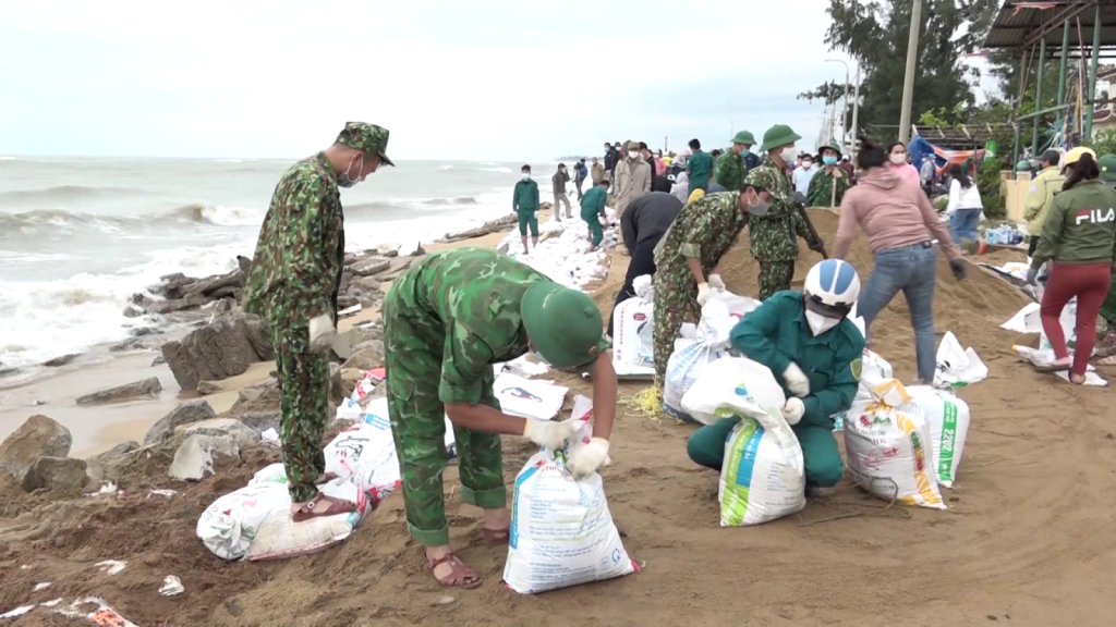 Triều cường gây xói lở bờ biển thôn Phổ Trường rất nghiêm trọng, lực lượng quân đội cùng với nhân dân dùng bao cát, cọc tre, gỗ gia cố ngăn chặn xâm thực tạm thời. (Ảnh: Minh Huy)