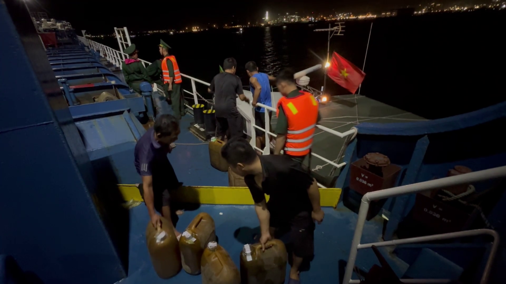 Đêm qua 16/12, Bộ đội Biên phòng Quảng Ngãi đã bắt giữ 01 tàu vận tải về hành vi mua bán xăng dầu không có hóa đơn chứng từ. Tang vật thu giữ trên 2.000 lít dầu D.O.