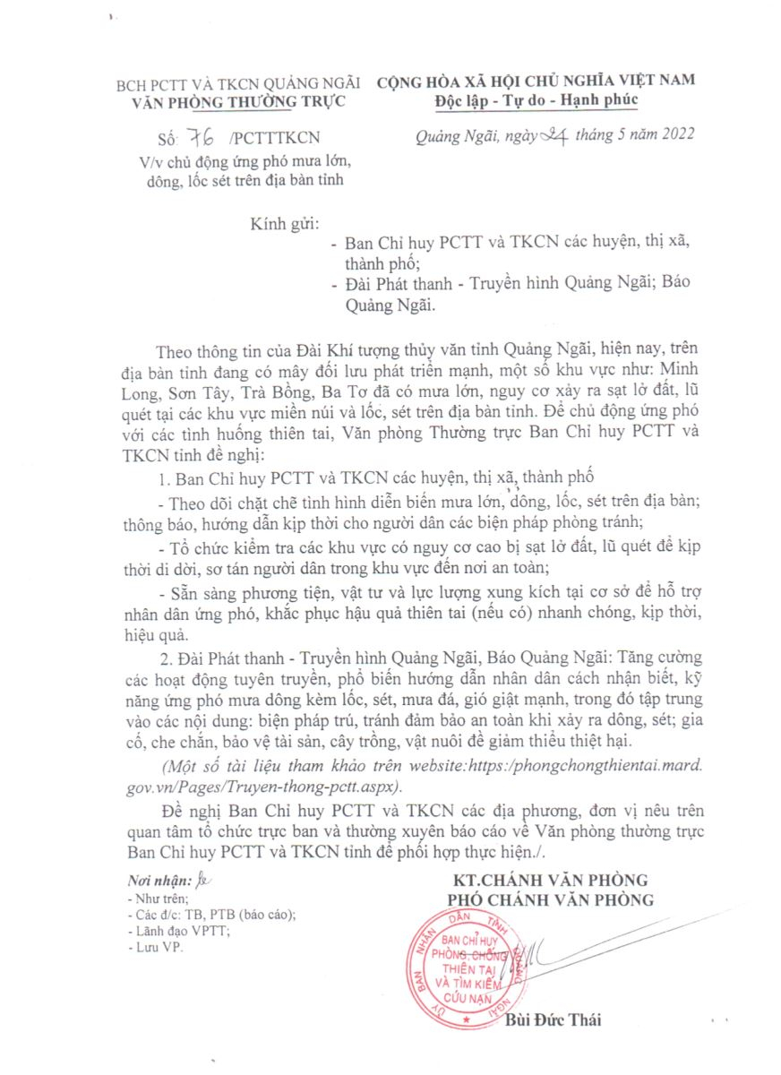 Theo thông tin của Đài khí tượng thủy văn Quảng Ngãi, hiện nay trên địa bàn tỉnh đang có mây đối lưu phát triển mạnh nên có mưa lớn, nguy cơ xảy ra sạt lở đất, lũ quét tại các khu vực miền núi và lốc, sét trên địa bàn tỉnh. Để chủ động ứng phó với các tình huống thiên tai, ngày 24/5/2022 văn phòng thường trực ban chỉ huy PCTT và tìm kiếm cứu nạn tỉnh có Công văn số 76/PCTTTKCN về việc chủ dộng ứng phó với mưa lớn, dông, lốc sét trên địa bàn tỉnh. Nội dung Công văn như sau: