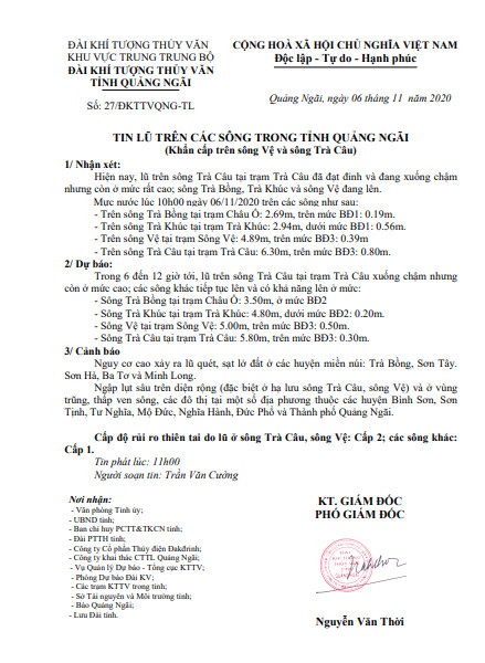 Quảng Ngãi: lũ trên sông Trà Câu đã đạt đỉnh và đang xuống chậm nhưng còn ở mức rất cao
