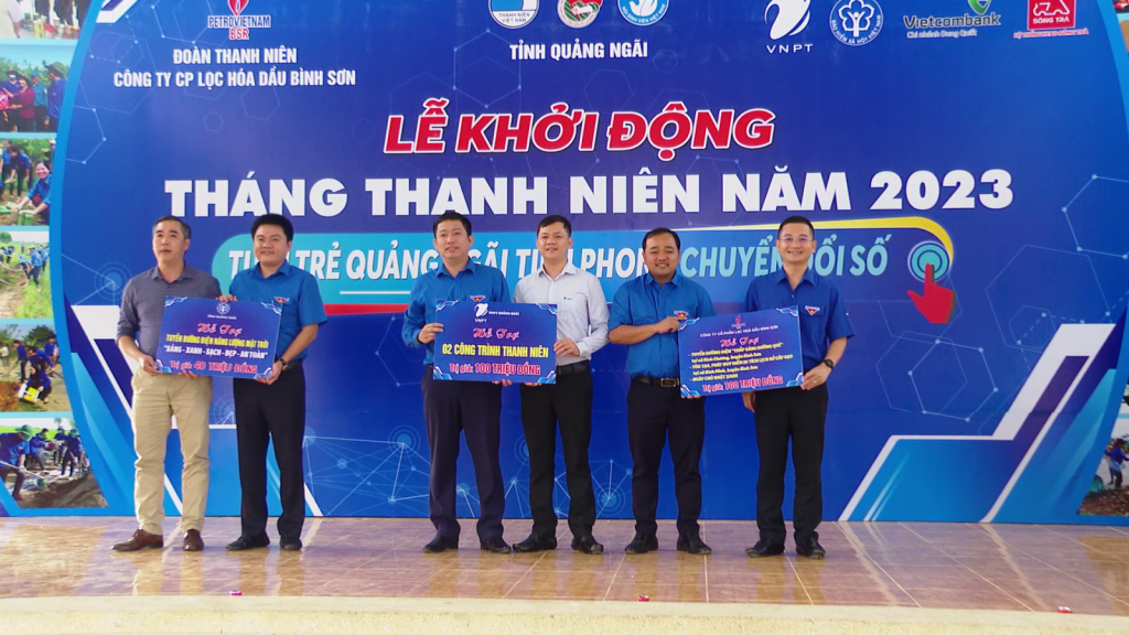 Dịp này, VNPT Quảng Ngãi đã trao hỗ trợ thực hiện 02 công trình thanh niên trị giá 100 triệu đồng. Đoàn Thanh niên Công ty Cổ phần Lọc hóa dầu Bình Sơn trao hỗ trợ Tháng Thanh niên với số tiền 100 triệu đồng. Bảo hiểm xã hội tỉnh Quảng Ngãi trao hỗ trợ thực hiện công trình thanh niên Tuyến đường điện năng lượng mặt trời trị giá 40 triệu đồng. Tỉnh Đoàn cũng phối hợp với VietcomBank Dung Quất và Honda Sông Trà trao tặng 30 suất quà, gồm 500 nghìn tiền mặt và 01 mũ bảo hiểm cho các hộ gia đình chính sách, hộ nghèo trên địa bàn huyện Bình Sơn.