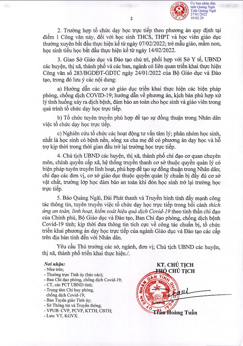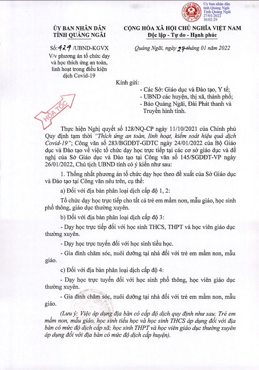 Để đảm bảo thích ứng an toàn, linh hoạt, kiểm soát hiệu quả dịch Covid-19 và đề nghị của Sở Giáo dục và Đào tạo về việc tổ chức dạy và học trực tiếp tại các cơ sở giáo dục, ngày 27/01/2022, Chủ tịch UBND tỉnh ban hành Công văn Hỏa tốc số: 424/UBND-KGVX về việc phương án tổ chức dạy và học thích ứng an toàn, linh hoạt trong điều kiện dịch Covid-19. Nội dung Công văn như sau: