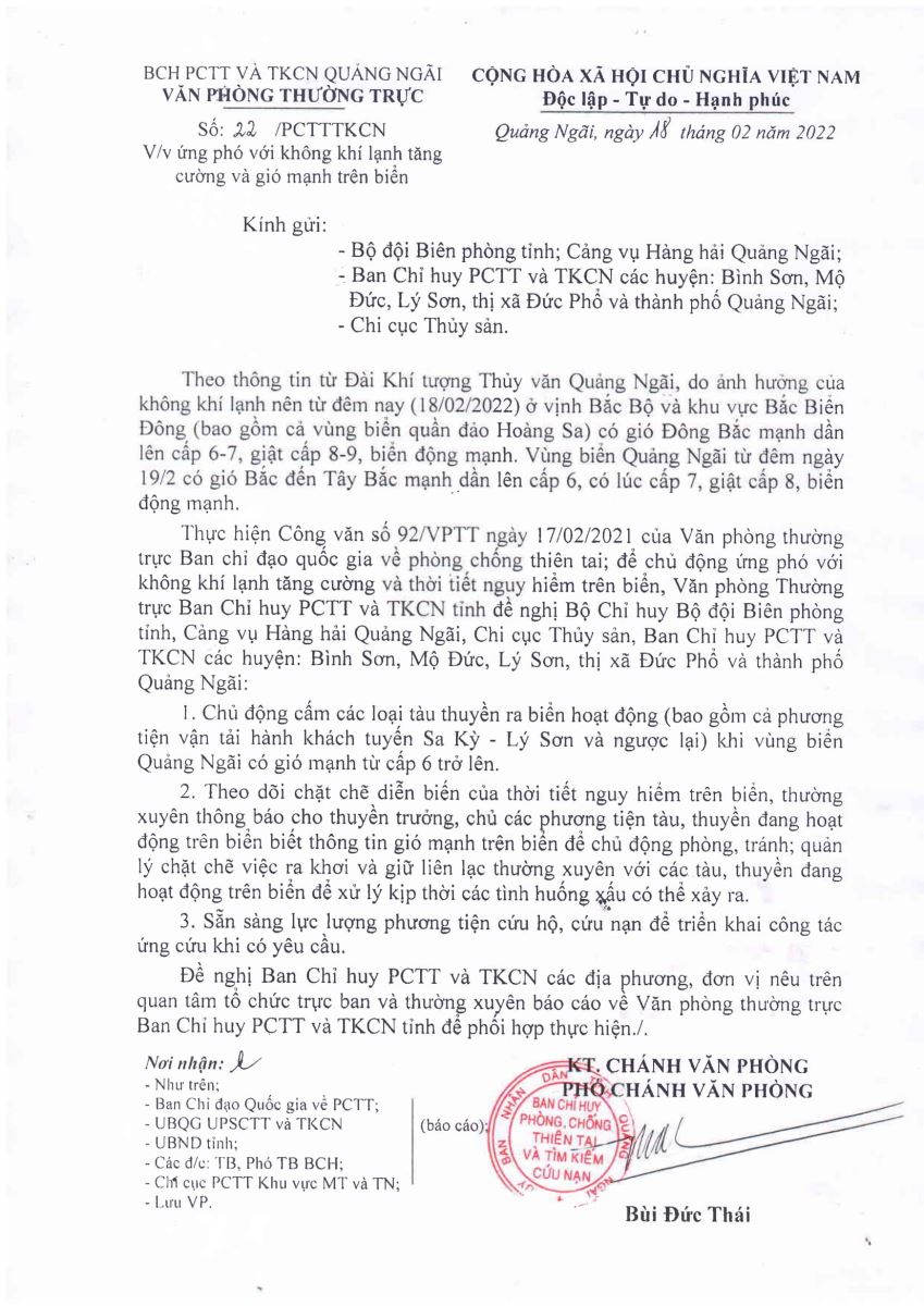 Ban chỉ huy Phòng chống thiên tai và tìm kiếm cứu nạn tỉnh Quảng Ngãi vừa có công văn số 22/PCTTTKCN ứng phó với không khí lạnh tăng cường và gió mạnh trên biển.