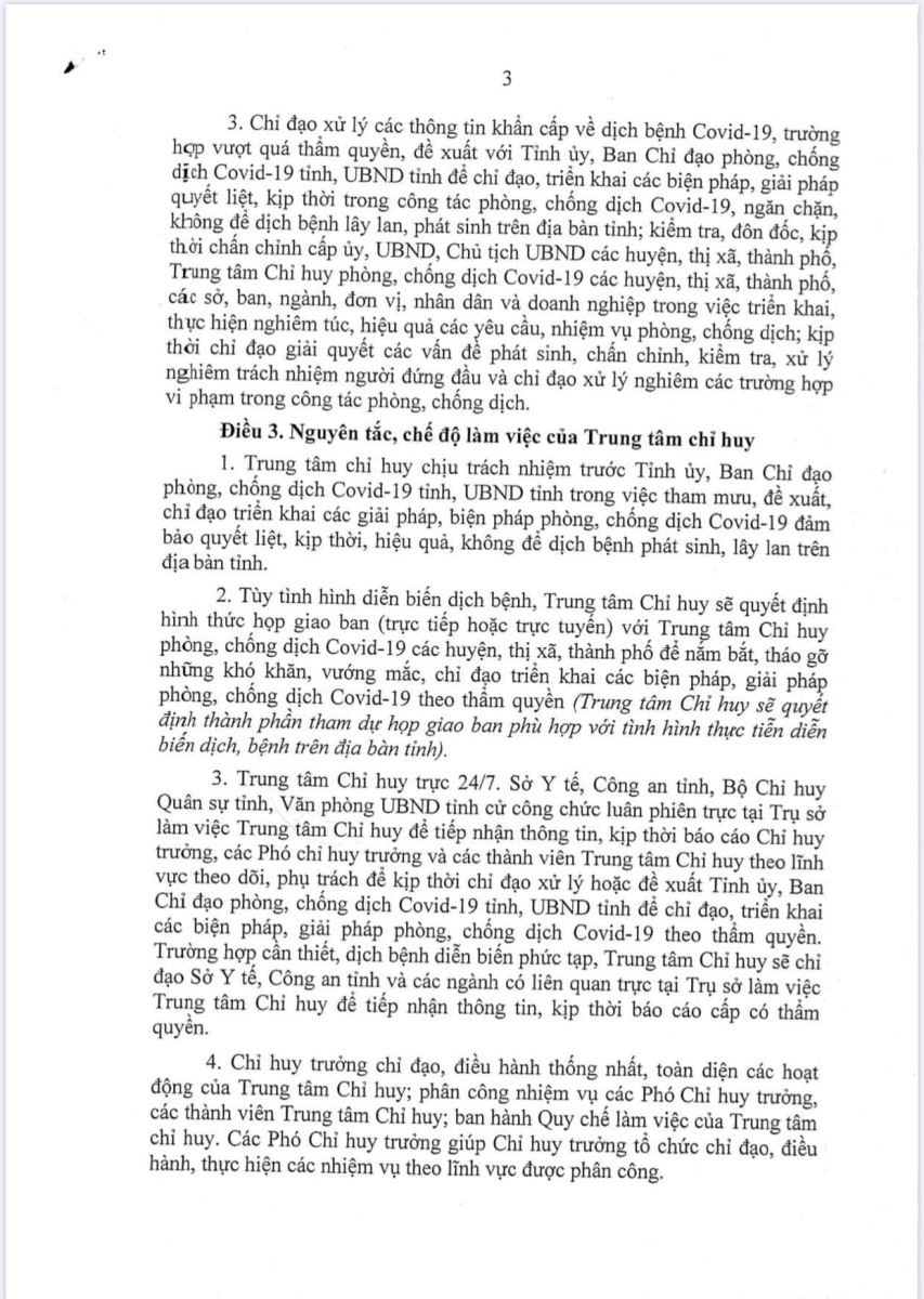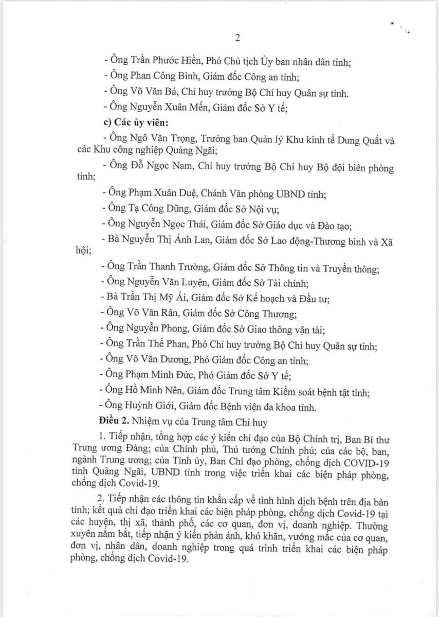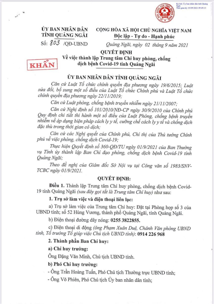 Chủ tịch UBND tỉnh Quảng Ngãi Đặng Văn Minh Quảng Ngãi đã ký Quyết định thành lập Trung tâm Chỉ huy phòng, chống dịch bệnh COVID-19.