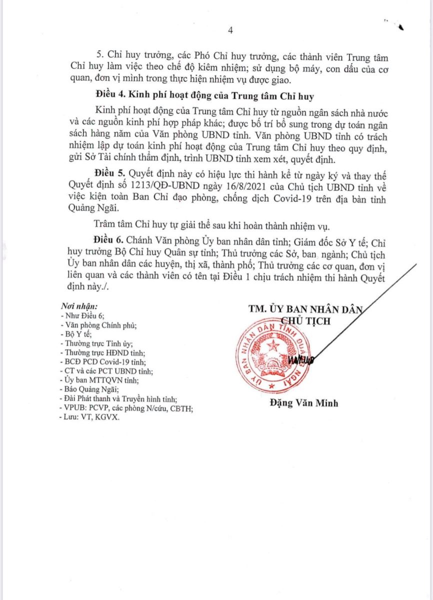 Chủ tịch UBND tỉnh Quảng Ngãi Đặng Văn Minh Quảng Ngãi đã ký Quyết định thành lập Trung tâm Chỉ huy phòng, chống dịch bệnh COVID-19.