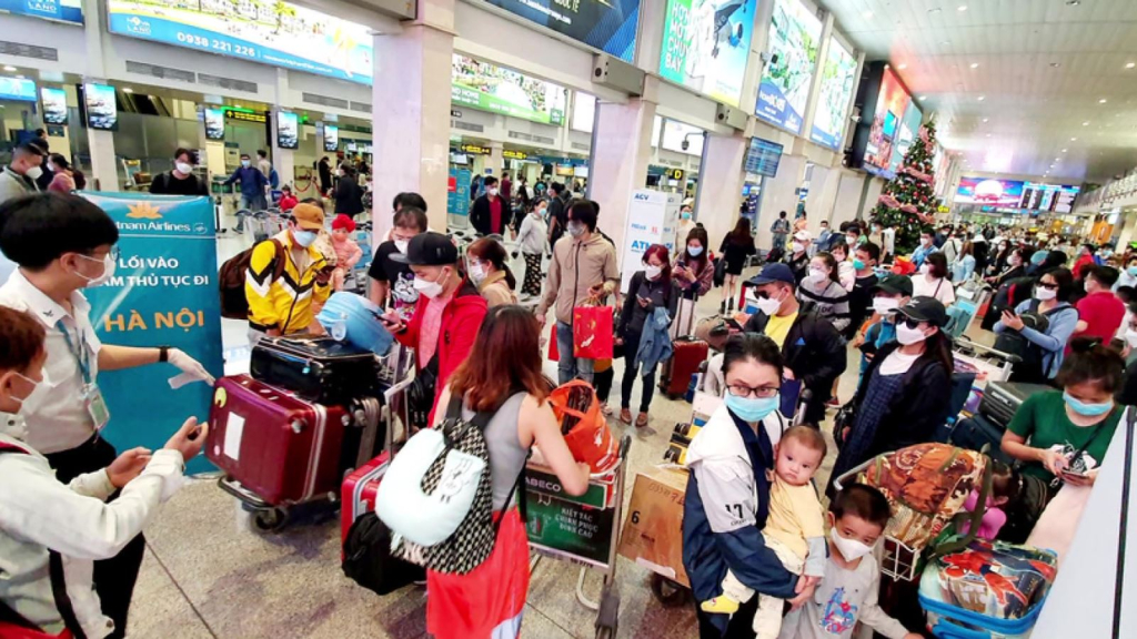 Có nhiều khung giờ hành khách chôn chân ở sảnh chờ làm thủ tục check-in và an ninh. Mặc dù các hãng bay phân luồng khách theo từng chặng bay cụ thể, nhưng khách đi Hà Nội, Hải Phòng, Vinh có số lượng khách đi lại đông, đặc biệt từ 5-10 giờ và 15-18 giờ. Quy định về điều kiện khách đi máy bay đã dễ dàng hơn. Ngoài bắt buộc khai báo PC-COVID, các thủ tục còn lại cũng tương tự những năm trước. Trước tình trạng lượng hành khách tại sân bay Tân Sơn Nhất đang tăng, Cục Hàng không đề nghị các đơn vị chuẩn bị phương án, sẵn sàng bay cả ngày lẫn đêm dịp Tết.