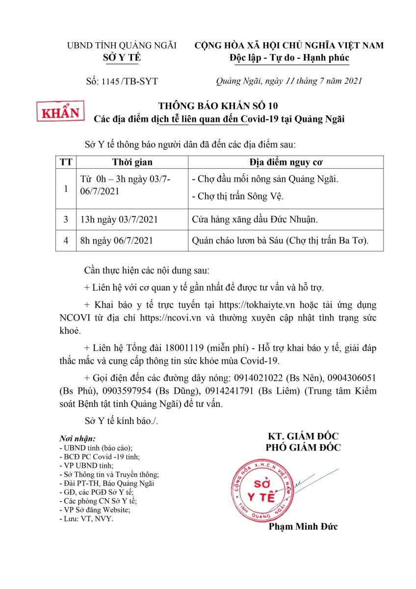 Sở Y tế Quảng Ngãi: Thông báo khẩn số 10
