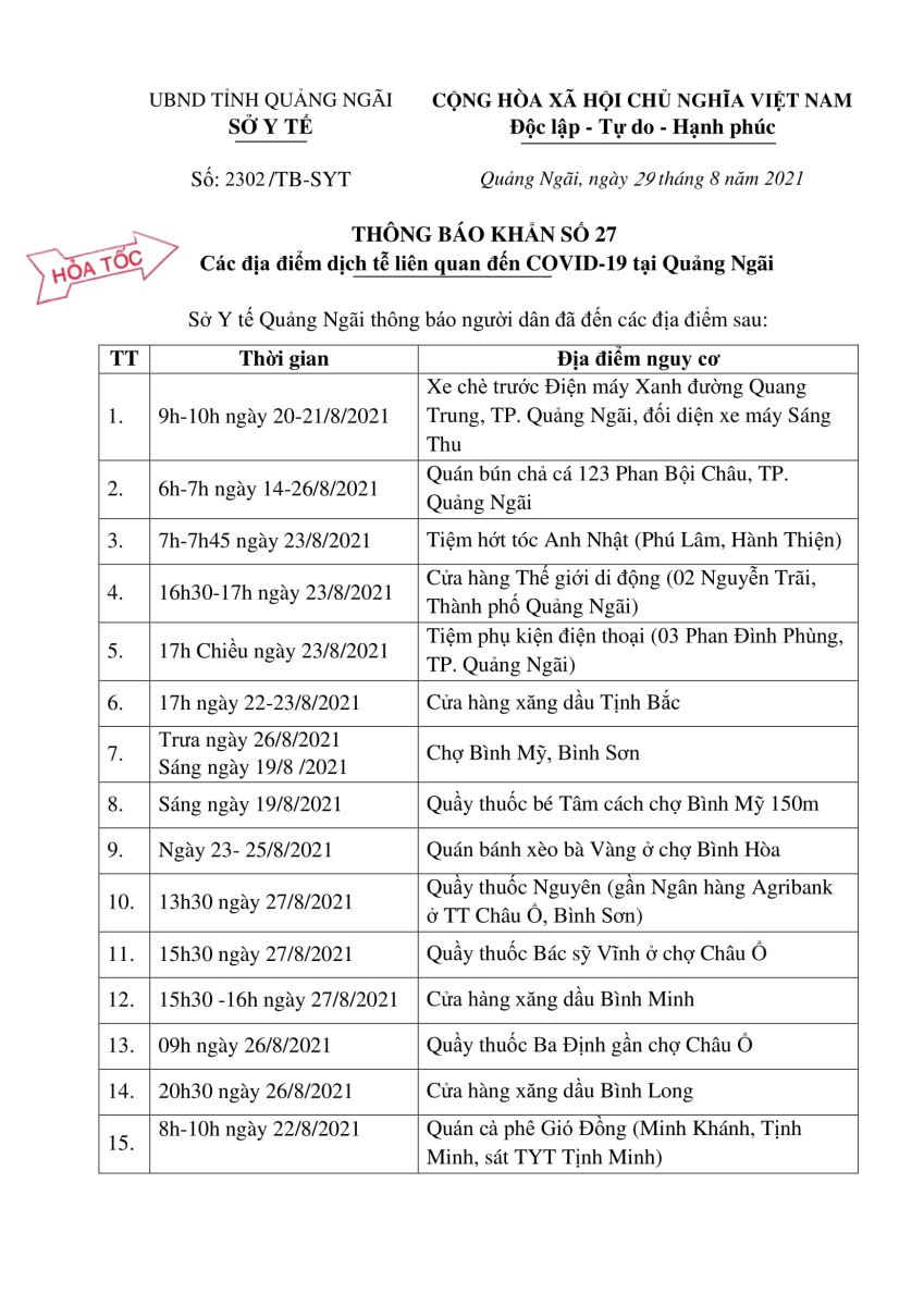 Sở Y tế Quảng Ngãi: Thông báo khẩn số 27