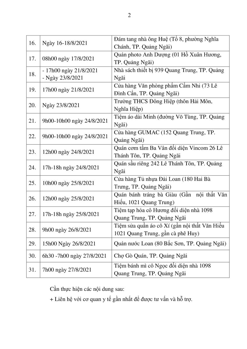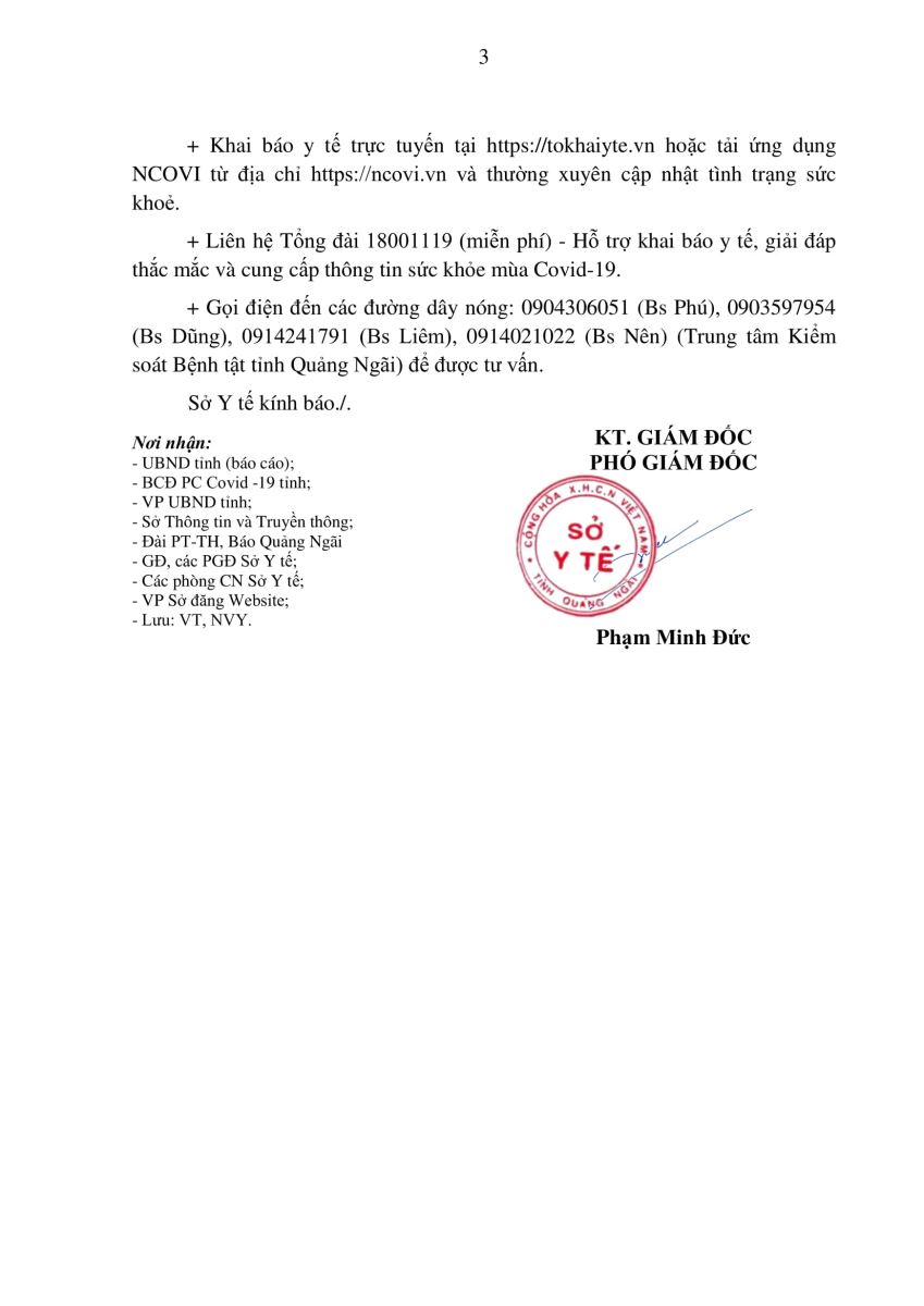 Người dân đã đến các địa điểm dịch tễ liên quan đến Covid-19 tại Quảng Ngãi cần thực hiện các nội dung sau: Liên hệ với cơ quan y tế gần nhất để được tư vấn hỗ trợ; khai báo y tế trực tuyến tại https://tokhaiyte.vn hoặc tải ứng dụng NCOVI từ địa chỉ https://ncovi.vn và thường xuyên cập nhật tình trạng sức khoẻ; Liên hệ Tổng đài 18001119 (miễm phí) - Hỗ trợ khai báo y tế, giải đáp thắc mắc và cung cấp thông tin sức khỏe mùa Covid-19; Gọi điện đến các đường dây nóng: 0914021022 (Bs Nên), 0904306051 (Bs Phú), 0903597954 (Bs Dũng), 0914241791 (Bs Liêm) (Trung tâm Kiểm soát Bệnh tật tỉnh Quảng Ngãi) để được tư vấn.