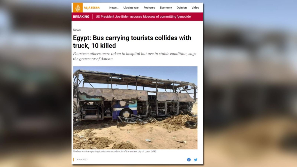 Ít nhất 10 người thiệt mạng trong một vụ tai nạn xe buýt nghiêm trọng xảy ra hôm nay tại miền Nam Ai Cập. Đáng chú ý, một nửa số nạn nhân là du khách nước ngoài. Vụ tai nạn xảy ra trong bối cảnh Ai Cập đang nỗ lực phục hồi ngành du lịch vốn chịu ảnh hưởng bởi cuộc chính biến năm 2011 cùng sự bùng phát của đại dịch COVID-19 trong vài năm gần đây.