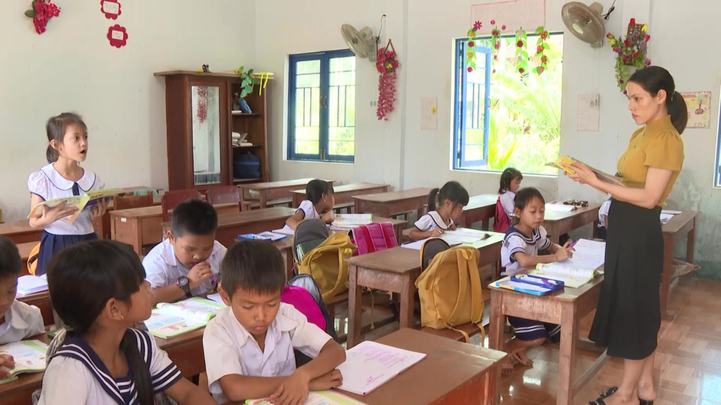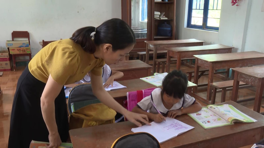 Lớp ghép nên bảng phải chia đôi. Hết dạy lớp này, cô quay sang dạy lớp khác. Học sinh con em đồng bào dân tộc tiếng Kinh chưa sỏi cứ nghiêng mình theo nét bút, tập tính toán một, hai. Cô giáo Kem bận rộn dạy dỗ, chỉ bày.