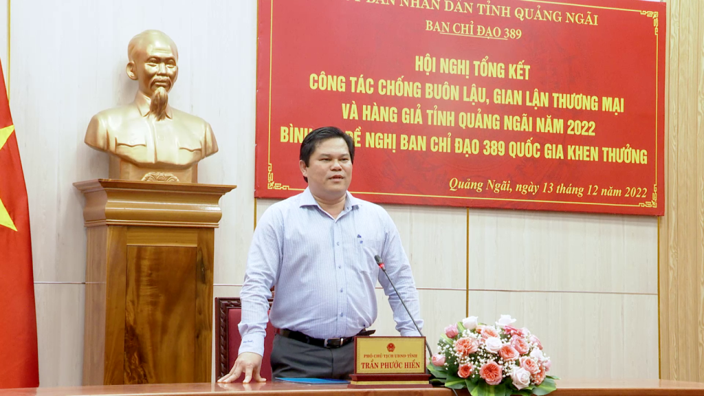 Tăng cường công tác chống buôn lậu, gian lận thương mại và hàng giả, nhất là trong dịp trước, trong và sau Tết Nguyên đán Quý Mão 2023. Chỉ đạo của Phó Chủ tịch UBND tỉnh Trần Phước Hiền, Trưởng Ban Chỉ đạo 389 tỉnh Quảng Ngãi tại hội nghị tổng kết công tác chống buôn lậu, gian lận thương mại và hàng giả năm 2022 tổ chức trong sáng nay.