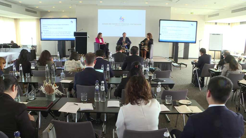 Chủ tọa phiên thảo luận thứ ba với chủ đề “Phát triển thương mại bền vững và xây dựng chuỗi cung ứng chủ động thích ứng”, Đại sứ Việt Nam tại Vương quốc Bỉ, Trưởng Phái đoàn Việt Nam bên cạnh EU, Nguyễn Văn Thảo, đánh giá cao sự hợp tác hiệu quả của EU với ASEAN, nhấn mạnh những kết quả tích cực đạt được trong quan hệ ASEAN - EU thời gian qua.