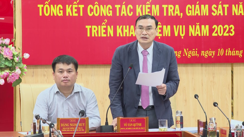 Ủy ban Kiểm tra các cấp phải tiếp tục quán triệt phương châm “giám sát phải mở rộng để kịp thời phát hiện, nhắc nhở, cảnh báo, phòng ngừa xảy ra vi phạm từ sớm. Không để khuyết điểm vi phạm nhỏ tích tụ thành sai phạm lớn, kéo dài và lan rộng dẫn đến vi phạm kỉ luật của Đảng và pháp luật. Kiểm tra có trọng tâm, trọng điểm và xử lý kỷ luật nghiêm minh, kịp thời, không có vùng cấm, không có ngoại lệ”. Ủy viên Bộ Chính trị, Thường trực Ban Bí thư Võ Văn Thưởng nhấn mạnh tại Hội nghị trực tuyến toàn quốc tổng kết công tác kiểm tra, giám sát năm 2022, triển khai nhiệm vụ năm 2023 do Ban Bí thư Trung ương Đảng tổ chức. Phó Bí thư Thường trực Tỉnh ủy, Trưởng Đoàn đại biểu Quốc hội tỉnh Đặng Ngọc Huy, Chủ nhiệm Ủy Ban Kiểm tra Tỉnh ủy Võ Văn Quỳnh chủ trì tham dự tại điểm cầu Quảng Ngãi.