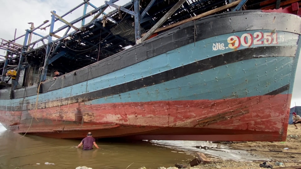 Trở về bến sau phiên biển cuối vụ, ngư dân Thanh và bạn thuyền khẩn trương đưa con tàu gần 800 mã lực lên bờ để cạo hàu, sơn sửa, thay mới các giang, đà đã hỏng. Hơn 09 tháng câu mực ở vùng biển khơi, chống chọi với sóng to, gió lớn, nên con tàu cần phải được sơn sửa để đảm bảo an toàn cho mùa biển mới.