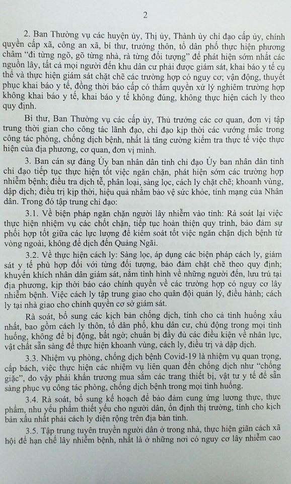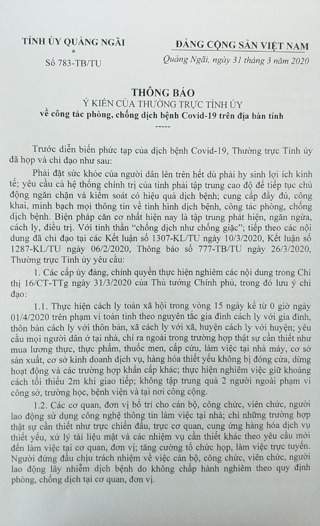 THÔNG BÁO Ý KIẾN CỦA THƯỜNG TRỰC TỈNH ỦY VỀ CÔNG TÁC PHÒNG CHỐNG DỊCH BỆNH COVID-19 TRÊN ĐỊA BÀN TỈNH QUẢNG NGÃI (Thông báo số 783-TB/TU ngày 31.3.2020)