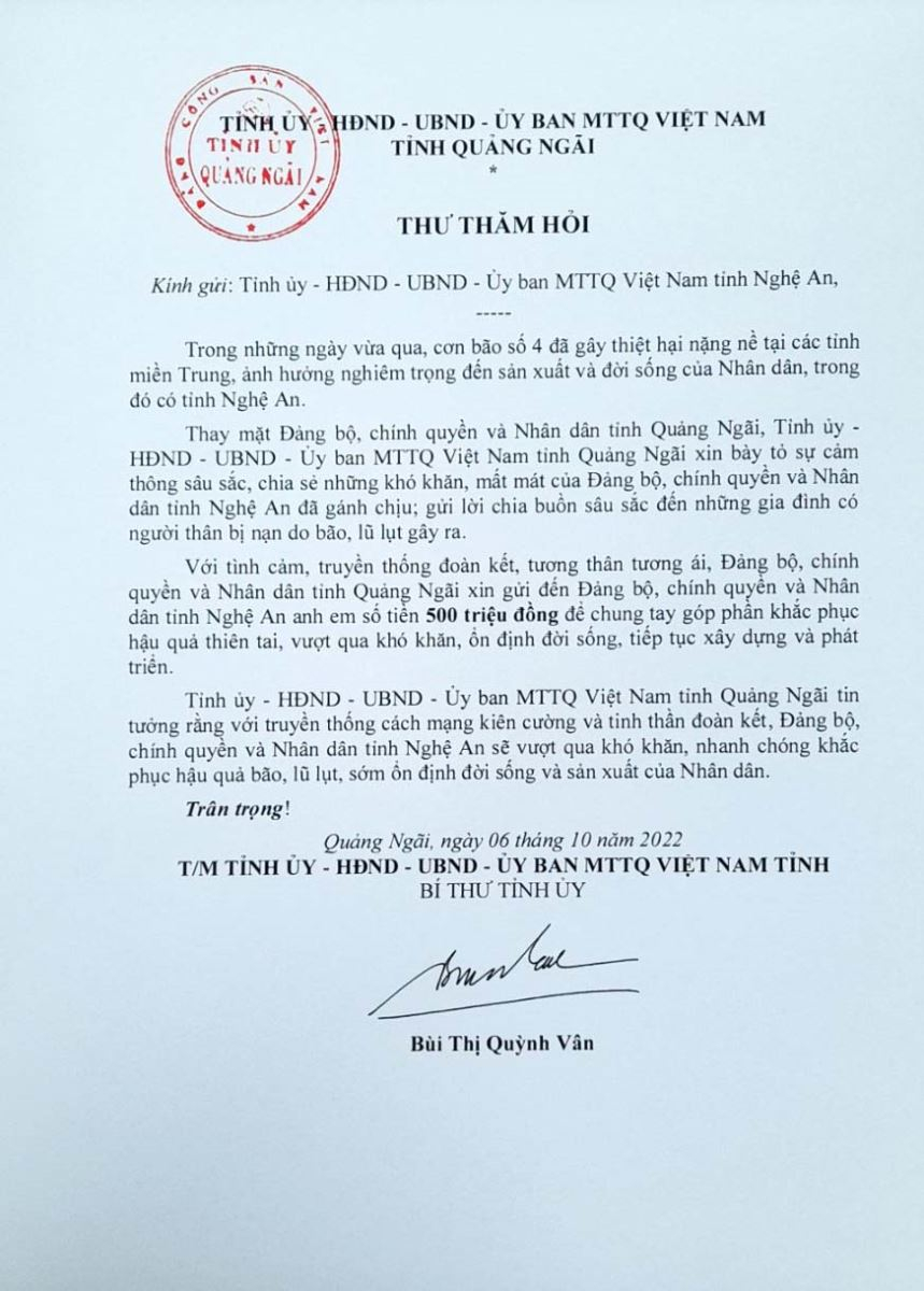 Tỉnh Uỷ-HĐND-UBND-Uỷ ban MTTQ VN tỉnh Quảng Ngãi gửi Thư thăm hỏi đến Đảng bộ, Chính quyền và nhân dân tỉnh Nghệ An sau thiệt hại của cơn bão số 4