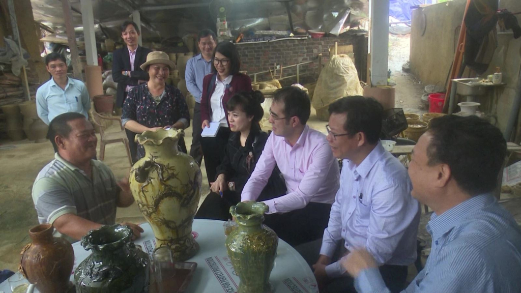 Đoàn giám sát của Hội đồng Quản trị Ngân hàng CSXH Việt Nam kiểm tra cơ sở gốm truyền thống Mỹ Thiện. Ảnh: Văn Việt.