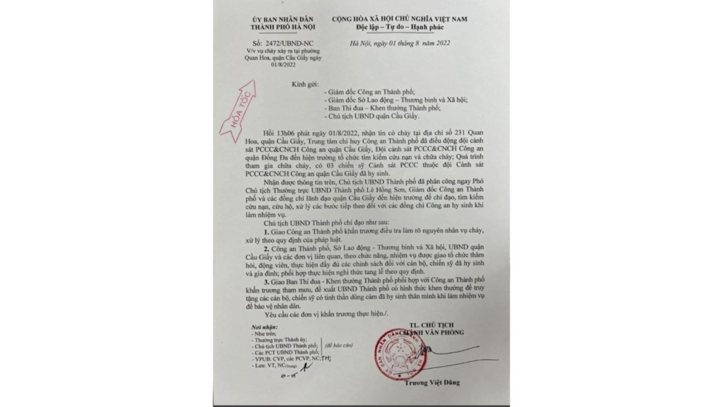 Liên quan đến vụ cháy xảy ra tại số 231 Quan Hoa, Cầu Giấy, UBND thành phố Hà Nội đã ban hành Văn bản số gửi Giám đốc Công an thành phố; Giám đốc Sở Lao động - Thương binh và Xã hội; Ban Thi đua - Khen thưởng thành phố; Chủ tịch UBND quận Cầu Giấy về vụ cháy xảy ra tại phường Quan Hoa quận Cầu Giấy.