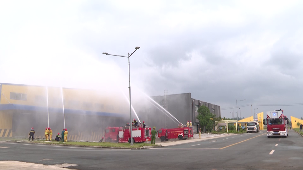 Tình huống giả định: vào buổi sáng, tại nhà xưởng sản xuất 2 của Công ty TNHH Gesin Việt Nam đã xảy ra cháy do chập điện. Tia lửa điện đã bắn vào sản phẩm nệm mút sau đó cháy lan ra các sản phẩm khác. Thời điểm cháy công nhân chưa hoạt động sản xuất bên trong nhà máy nên không phát hiện hiện đám cháy kịp thời nên đám cháy lan nhanh, cháy lớn. Ngọn lửa nhanh chóng lan ra 300 mét vuông mặt sàn nhà xưởng sản xuất và có khả năng lan rộng ra toàn bộ nhà xưởng, nguy cơ sập đổ công trình. Khi hỏa hoạn xảy ra bên trong nhà xưởng có lượng chất cháy khoảng 40 tấn hàng chưa thành phẩm và sản phẩm đang chờ xuất khẩu. Sau khi phát hiện đám cháy, lực lượng chữa cháy của Công ty đã bấm chuông báo cháy, dùng loa thông báo cho mọi người thoát nạn ra bên ngoài. Lực lượng chữa cháy của doanh nghiệp và Công ty TNHH Vsip Quảng Ngãi đã triển khai chữa cháy. Tuy nhiên đám cháy lớn không thể dập tắt nên đã báo lên lực lượng phòng cháy chữa cháy và cứu nạn cứu hộ của Công an tỉnh. Sau 15 phút, Công an tỉnh đã điều 6 xe chữa cháy chuyên dụng, xe thang, xe bồn tiếp nước cùng 170 cán bộ, chiến sĩ có mặt tại hiện trường. Lực lượng chữa cháy Công an tỉnh đã dùng xe chuyên dụng tham gia cứu nạn và triển khai dập lửa từ các hướng, ngăn chặn đám cháy lan sang các nhà xưởng khác. Sau 45 phút triển khai phương án chữa cháy, đám cháy tại nhà xưởng sản xuất 2 của Công ty TNHH Gesin Việt Nam đã được dập tắt./.