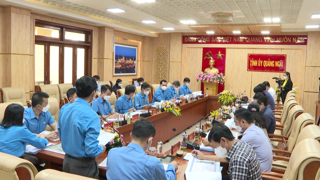 Lãnh đạo Liên đoàn Lao động tỉnh Quảng Ngãi báo cáo sơ lược kết quả nổi bật trong hoạt động Công đoàn và phong trào công nhân, viên chức, lao động tỉnh Quảng Ngãi quý I/2022. Các cấp công đoàn trong tỉnh đã nỗ lực chăm lo cho công nhân lao động có hoàn cảnh khó khăn, hỗ trợ kinh phí giúp đoàn viên bị ảnh hưởng của dịch COVID-19 vượt qua khó khăn. Tổ chức chăm lo Tết Nhâm Dần cho 74.000 đoàn viên, công nhân, viên chức, lao động với tổng kinh phí 43 tỷ đồng. Trong quý I, các cấp công đoàn đã kết nạp mới 1.270 đoàn viên. Về triển khai Dự án thiết chế công đoàn, tỉnh Quảng Ngãi đã giới thiệu cho Tổng Liên đoàn Lao động triển khai đầu tư dự án thiết chế của Công đoàn tại Khu công nghiệp Tịnh Phong, với diện tích hơn 2 ha.