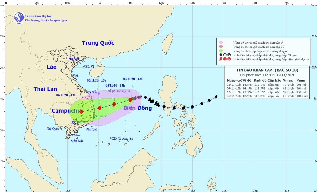 Hồi 13 giờ ngày 03/11, vị trí tâm bão ở khoảng 14,8 độ Vĩ Bắc; 115,1 độ Kinh Đông, cách quần đảo Hoàng Sa khoảng 370km về phía Đông Nam. Sức gió mạnh nhất vùng gần tâm bão mạnh cấp 8 (60-75km/giờ), giật cấp 10. Bán kính gió mạnh từ cấp 6, giật từ cấp 8 trở lên khoảng 140km tính từ tâm bão.