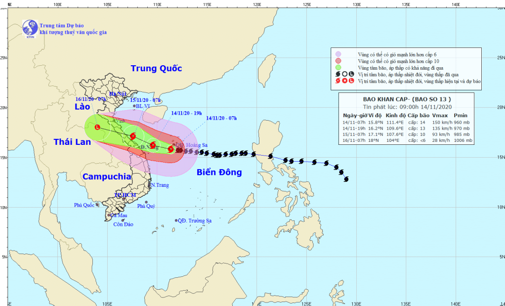 Hồi 07 giờ ngày 14/11 , vị trí tâm bão ở khoảng 15,8 độ Vĩ Bắc; 111,4 độ Kinh Đông, trên khu vực phía Nam quần đảo Hoàng Sa, cách Đà Nẵng-Thừa Thiên Huế khoảng 380km, cách Quảng Trị khoảng 460km về phía Đông Đông Nam. Sức gió mạnh nhất vùng gần tâm bão mạnh cấp 13-14 (135-165km/giờ), giật cấp 17 . Bán kính gió mạnh từ cấp 6, giật từ cấp 8 trở lên khoảng 250km tính từ tâm bão; bán kính gió mạnh từ cấp 10, giật từ cấp 12 trở lên khoảng 100km tính từ tâm bão.