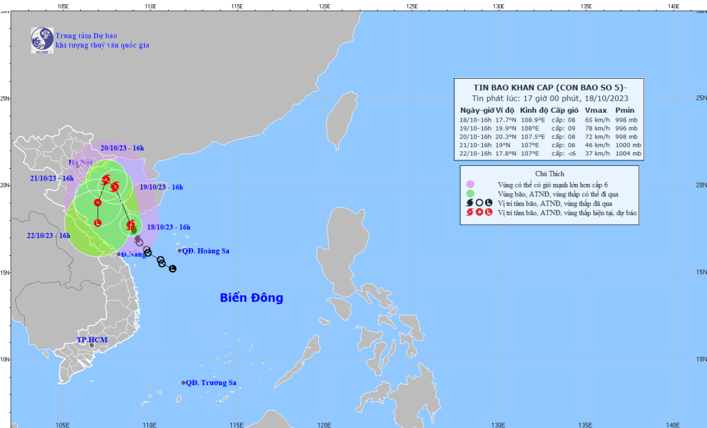 | 16h/19/10 | Bắc Tây Bắc, khoảng 10 km/h, và có khả năng mạnh thêm | 19,9N-108,0E; trên khu vực Vịnh Bắc Bộ | Cấp 8-9, giật cấp 11 | Phía Bắc vĩ tuyến 16,0N; phía Tây kinh tuyến 110,5E | Cấp 3: khu vực Vịnh Bắc Bộ, vùng biển từ Quảng Trị đến Quảng Nam |