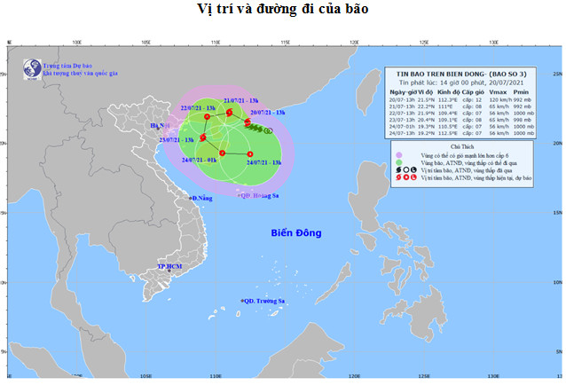 Dự báo trong 24 giờ tới, bão di chuyển theo hướng Tây Bắc, mỗi giờ đi được khoảng 5km. Đến 13 giờ ngày 21/7, vị trí tâm bão ở khoảng 22,2 độ Vĩ Bắc; 111,0 độ Kinh Đông, trên đất liền phía Tây Nam tỉnh Quảng Đông (Trung Quốc). Sức gió mạnh nhất vùng gần tâm bão mạnh cấp 8 (60-75km/giờ), giật cấp 10.