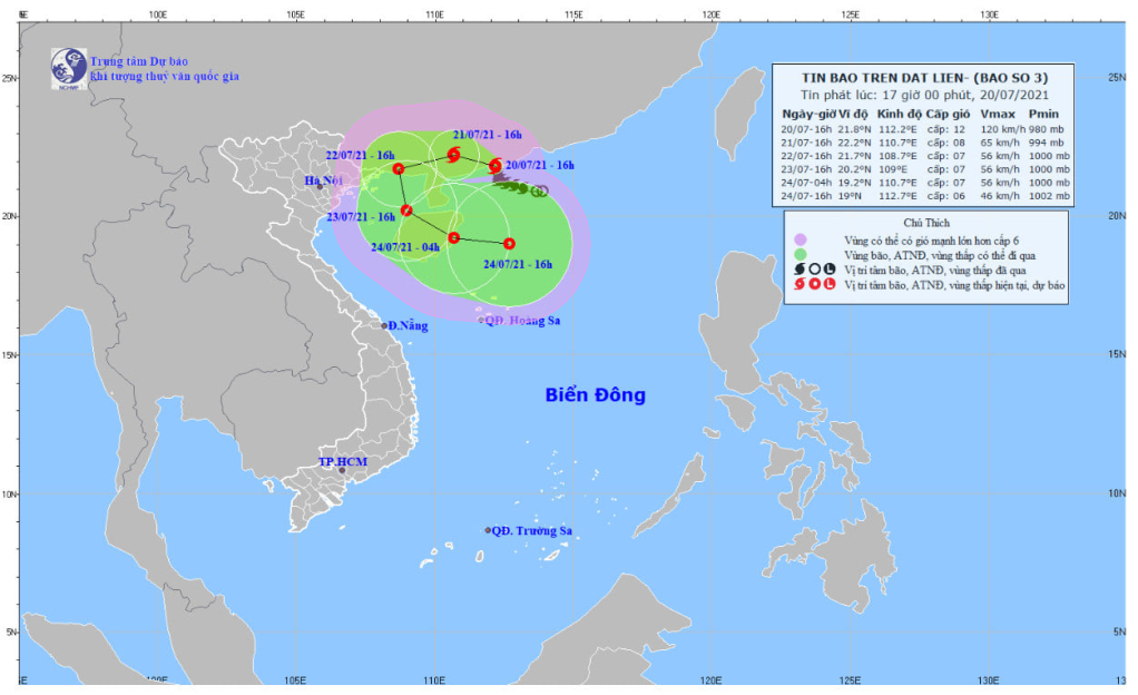 Dự báo trong 24 giờ tới, bão di chuyển theo hướng Tây Tây Bắc, mỗi giờ đi được khoảng 5km. Đến 16 giờ ngày 21/7, vị trí tâm bão ở khoảng 22,2 độ Vĩ Bắc; 110,7 độ Kinh Đông, trên đất liền phía Nam tỉnh Quảng Đông - Quảng Tây (Trung Quốc), cách Móng Cái (Quảng Ninh) khoảng 300km về phía Đông Đông Bắc. Sức gió mạnh nhất vùng gần tâm bão mạnh cấp 8 (60-75km/giờ), giật cấp 10.