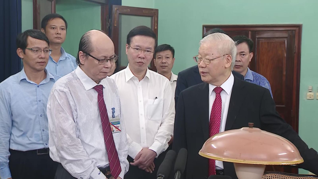 Nói chuyện thân mật với cán bộ, nhân viên Khu Di tích, Tổng Bí thư Nguyễn Phú Trọng hoan nghênh anh chị em trong mọi hoàn cảnh đã hết lòng, hết sức, truyền cảm tư tưởng, đạo đức, phong cách của Bác đến với những khách tham quan trong nước và quốc tế, thấm thía những điều Bác dạy và phải làm theo cho được tinh thần của Bác.