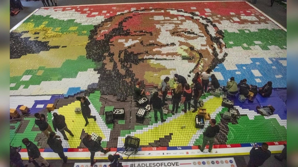 Bức tranh này do các tình nguyện viên của tổ chức từ thiện Những muôi thức ăn nghĩa tình thực hiện. Với sự ủng hộ của các nhà tài trợ doanh nghiệp thực phẩm và đồ uống cùng sự hỗ trợ của các tình nguyện viên nhiệt tình, tổ chức từ thiện này đã tổ chức việc sắp đặt gần 90.000 lon thực phẩm trên hai bức tranh ghép khổng lồ - một ở Trung tâm hội nghị quốc tế ở thành phố Cape Town và một ở Quảng trường Nelson Mandela ở thành phố Johannesburg - trong cùng một ngày.