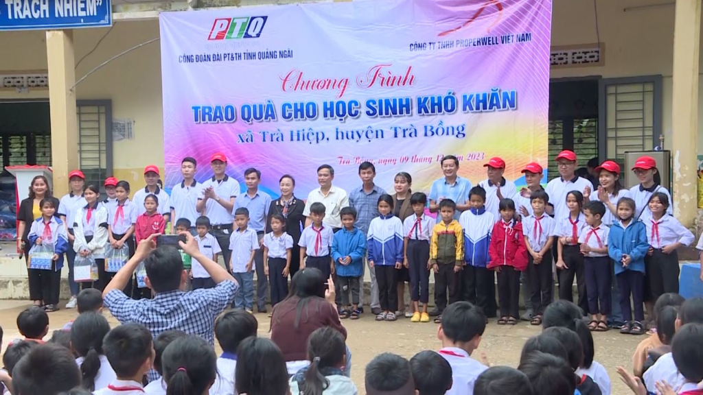 Trao 530 suất quà cho học sinh ở vùng cao xã Trà Hiệp, huyện Trà Bồng. Hoạt động do Công đoàn Cơ sở Đài PT & TH tỉnh Quảng Ngãi phối hợp cùng Công ty TNHH Properwell Việt Nam tổ chức trong sáng nay (09/12).
