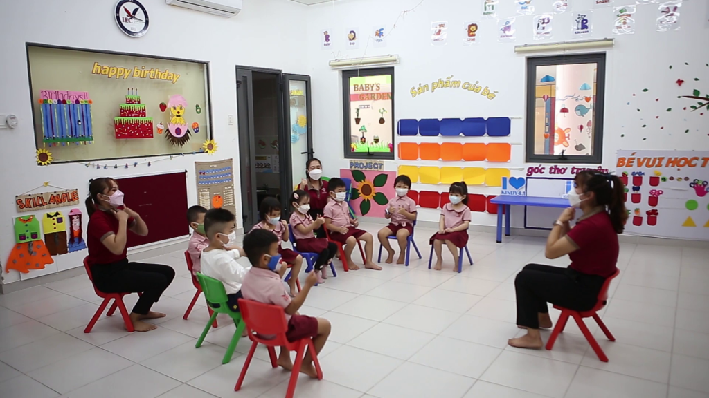 Khối Mầm non, tùy vào số lượng trẻ đăng kí, các trường chia nhỏ lớp học để giãn cách. Việc phối hợp phòng, chống dịch COVID-19 cho trẻ được chú trọng.