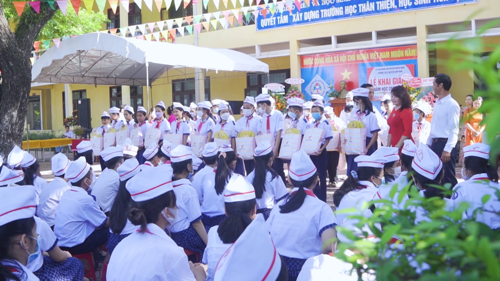 Tại lễ khai giảng, 387 học sinh của trường đều được nhận phần quà là dụng cụ học tập, cặp và máy tính casio từ gia đình của Liệt sỹ, Anh hùng lực lượng vũ trang nhân dân Nguyễn Kim Vang./.