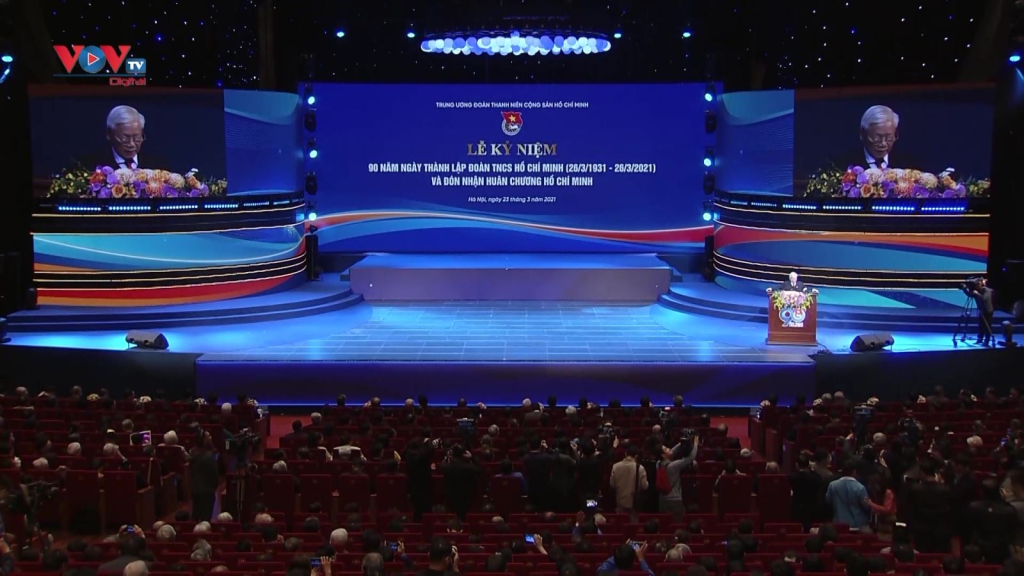 Trong bài phát biểu tại Lễ kỉ niệm 90 năm Ngày thành lập Đoàn, Tổng Bí thư, Chủ tịch Nước Nguyễn Phú Trọng đã tin tưởng và mong các bạn trẻ, đặc biệt là các bạn đoàn viên, đảng viên trẻ, rằng: hãy luôn luôn ghi nhớ ý nghĩa của chiếc huy hiệu mà các bạn đang đeo trang trọng trên ngực áo với lời Bác kính yêu căn dặn "Tay cầm cờ đỏ sao vàng tiến lên". Hãy luôn xung kích tiến lên trong học tập, lao động, sản xuất, chiến đấu, góp sức xây dựng quê hương, đất nước ta ngày càng đàng hoàng hơn, to đẹp hơn, xứng đáng với kỳ vọng và niềm tin yêu của Đảng, Bác Hồ và nhân dân cả nước đối với thế hệ trẻ./.