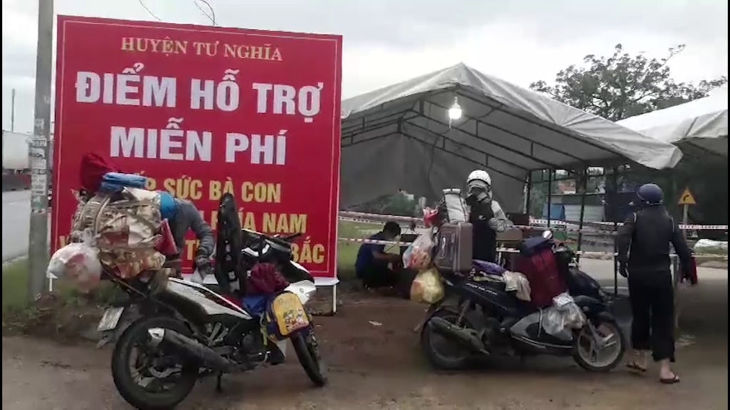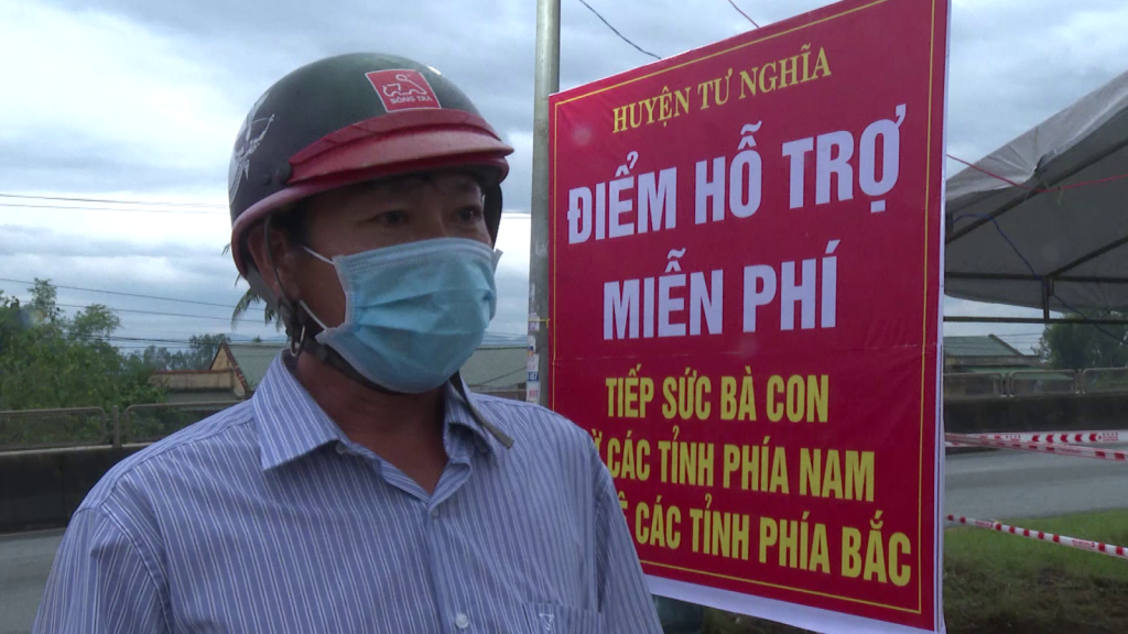 Tại huyện Tư Nghĩa, chính quyền địa phương, các hội đoàn thể đã thành lập các điểm tiếp sức để hỗ trợ nhu yếu phẩm cho người dân ở các tỉnh phía Nam trên đường về quê.