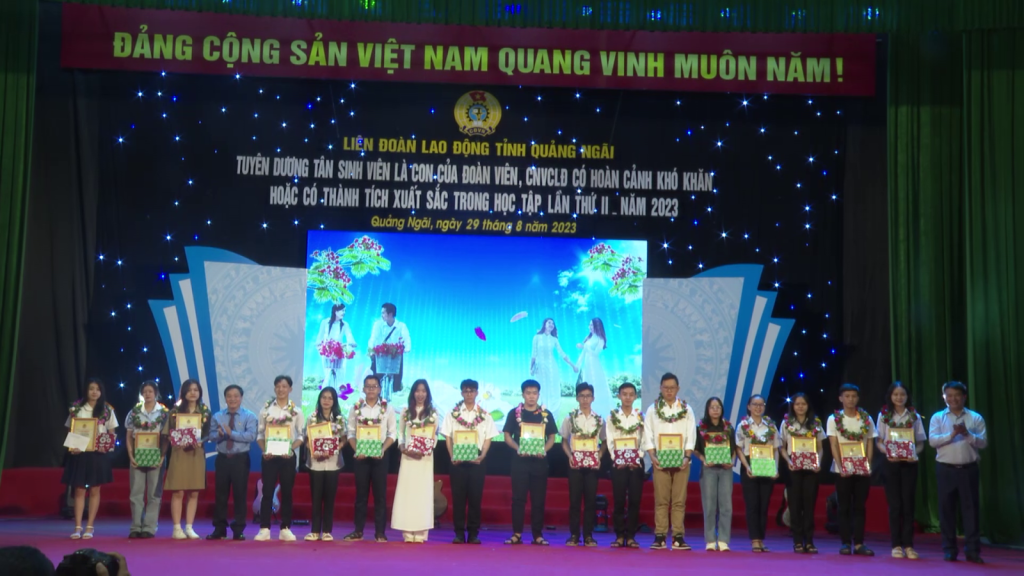 Liên đoàn Lao động tỉnh Quảng Ngãi và Hội Khuyến học tỉnh đã trao Giấy biểu dương và quà cho 40 tân sinh viên có thành tích tiêu biểu xuất sắc trong học tập. Mỗi suất quà 02 triệu đồng.