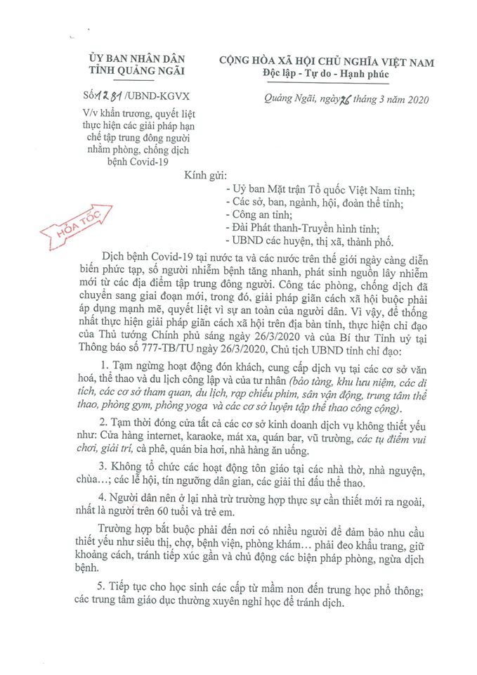UBND TỈNH QUẢNG NGÃI CHỈ ĐẠO KHẨN TRƯƠNG, QUYẾT LIỆT THỰC HIỆN CÁC GIẢI PHÁP HẠN CHẾ TẬP TRUNG ĐÔNG NGƯỜI NHẰM PHÒNG, CHỐNG DỊCH BỆNH COVID-19