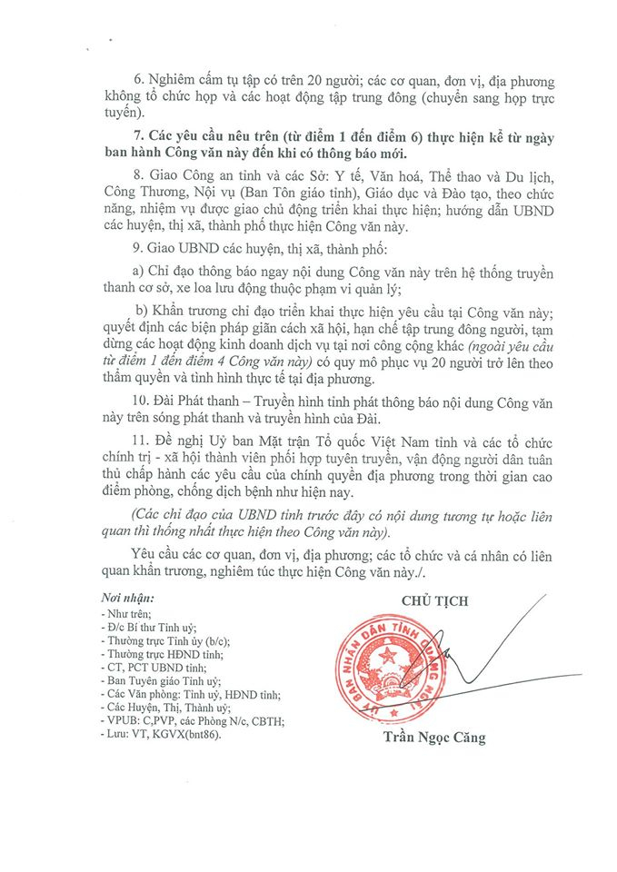 - Tiếp tục cho học sinh các cấp từ mầm non đến trung học phổ thông; các trung tâm giáo dục thường xuyên nghỉ học để tránh dịch. - Nghiêm cấm tụ tập có trên 20 người.