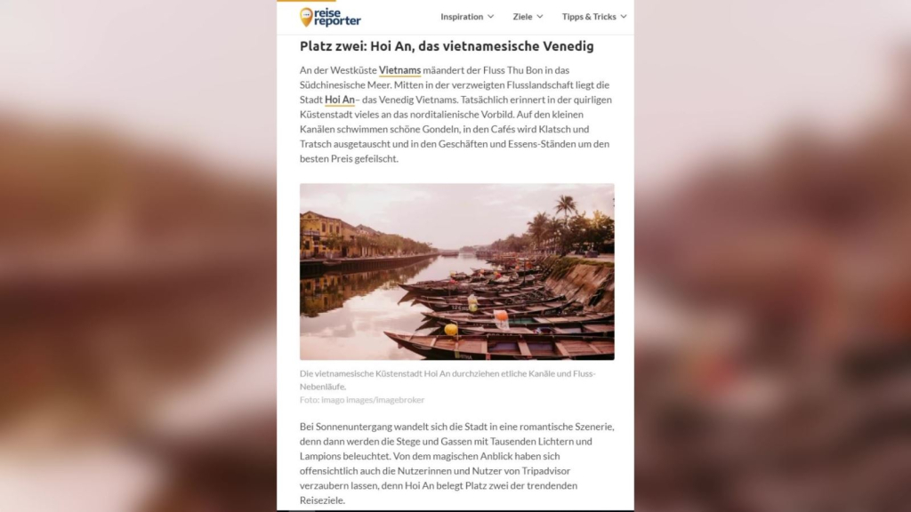 Trên trang chủ, reisereporter giới thiệu 3 điểm đến có xu hướng hấp dẫn nhất trong năm 2023, trong đó Hội An nằm ở vị trí số 2, dựa trên sự đánh giá của khách du lịch sử dụng Tripadvisor, một trong số nền tảng du lịch hàng đầu và lớn nhất thế giới.