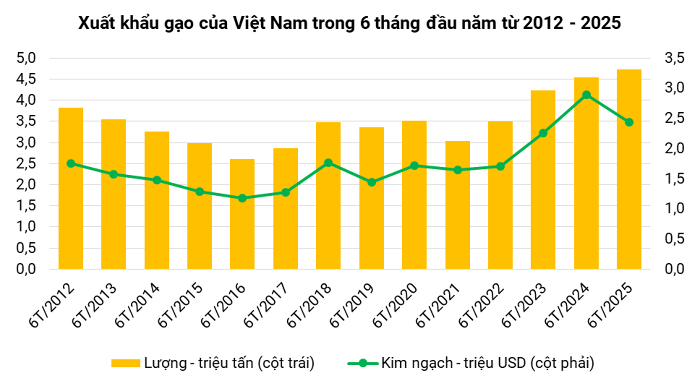 Theo số liệu của Cục Hải quan, trong 6 tháng đầu năm, xuất khẩu gạo của Việt Nam đạt kỷ lục (xét trong cùng giai đoạn ở các năm) hơn 4,7 triệu tấn, với kim ngạch thu về 2,44 tỷ USD, tăng 3,6% về lượng nhưng giảm 15,4% về kim ngạch so với cùng kỳ năm 2024.Giá gạo xuất khẩu bình quân 6 tháng đầu năm đạt 517 USD/tấn, giảm mạnh 18,3% (tương đương 116 USD/tấn) so với cùng kỳ năm ngoái.