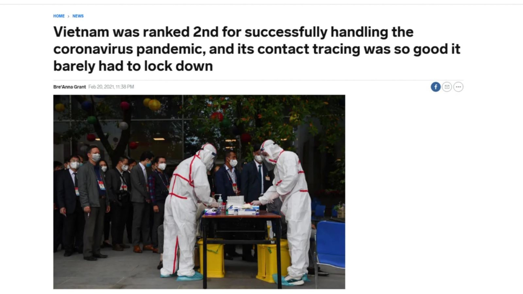 Trích dẫn bảng xếp hạng của Viện nghiên cứu Lowy (Úc), Business Insider khẳng định trong số các nước đang có dịch COVID-19, Việt Nam xếp thứ 2 về mức độ kiểm soát dịch hiệu quả, chỉ sau New Zealand.